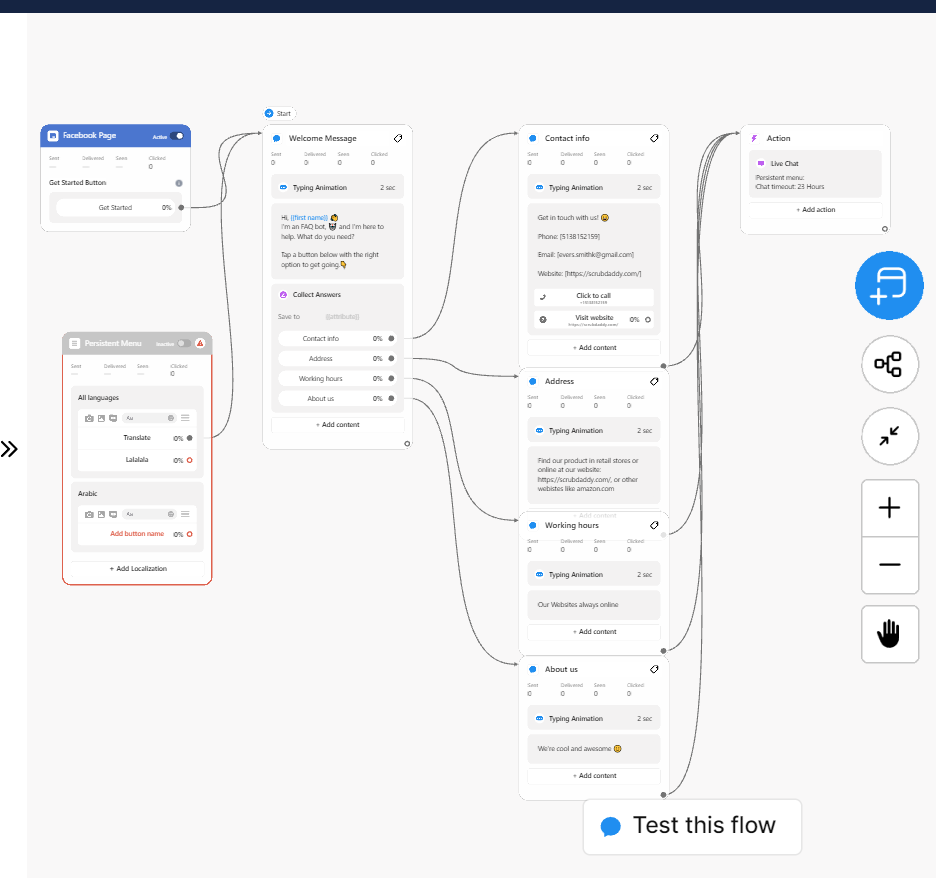 ChatFuel will be integrated into Scrub Daddy’s website: https://scrubdaddy.com/ with the goal to automate customer service FAQ needs with AI. The ChatFuel demonstration I created can be found at https://dashboard.chatfuel.com/bot/65e0ca23a7ae1a595696670e/flows/6632ecaa8a5b6f4a2d955622?blockId=6632ecaa8a5b6f4a2d955623 I don’t think there will be a problem with the link but here is a screenshot of the flow that I created: